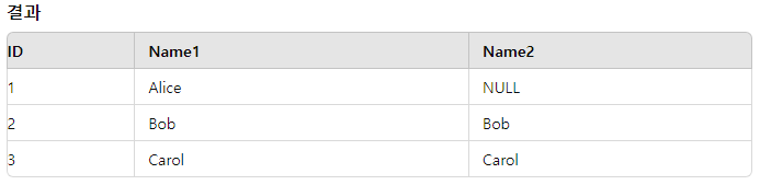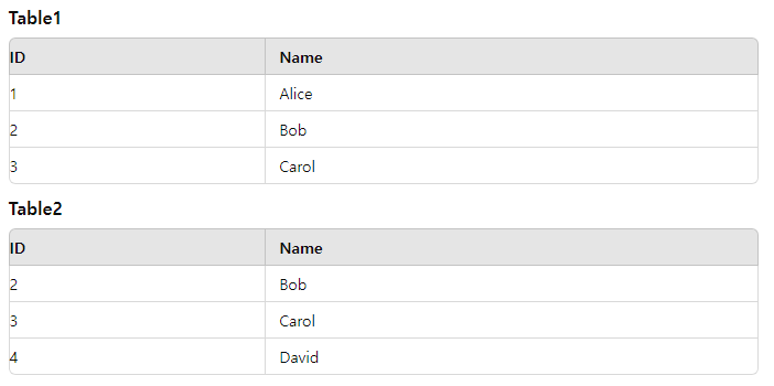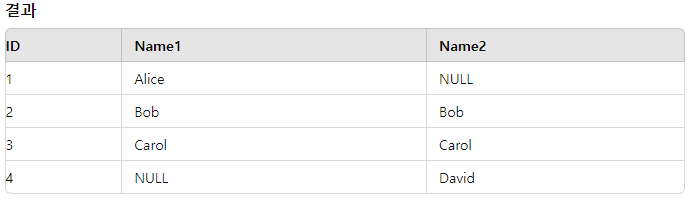 위 예제에서 table1과 table2에서 가져온 결과가 중복된 행 없이 결합됩니다.