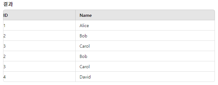 - 중복 제거: UNION은 결합된 결과에서 중복된 행을 제거합니다.