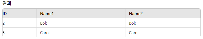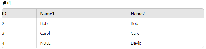 - 컬럼 수: UNION과 마찬가지로 결합되는 쿼리들은 동일한 수의 컬럼을 가져야 하며, 각 컬럼의 데이터 타입도 호환 가능해야 합니다.