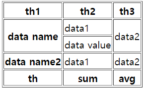 rowspan을 통해 data name과 data2를 세로로 2칸 병합