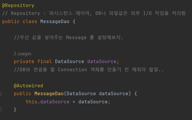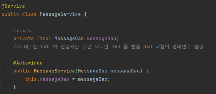 MessageService를 받을 배열 객체를 만들어 뒀는데 아직은 서비스를 구현하지 않았으니 주석 달아주고 Dao, Service 만들어 주면 컨트롤에서 마저 작성하자.