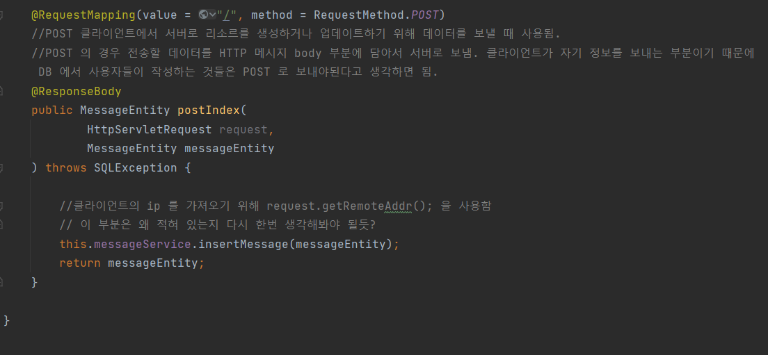 어노테이션 걸어주고 insert의 경우 값이 항상 일정하지 않으니 POST의 방식으로 보내고 일단 받는 매개변수를 request와 MessageEntity만 넣어 줬는데 Model and View를 넣어서 받아도 되긴 하는데 일단 저렇게 해보자... 근데 request 변수를 통해 getRemoteAddr을 사용했는데 적어놓고 잘 모르겠음.. 다시 한번 적으면서 공부를 해보자.