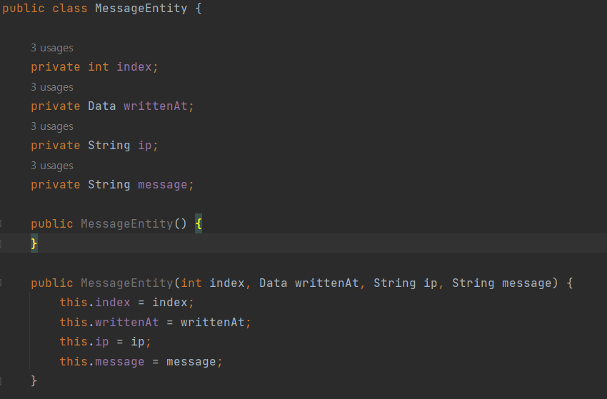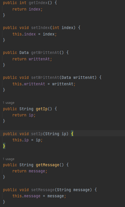 void 타입의 insert 메서드 만들어 주고 VALUES에 들어갈 값을 "?"로 지정해서 Entity의 값들을 넣어주게 함. 여기서 ip와 message만 넣은 이유는 기본키인 index의 경우 Auto_increment이고 written_at의 경우 Default 값을 설정해주었기 때문에 값을 넣지 않아도 알아서 값이 들어가기 때문에 ip와 message의 값만 넣어주었음. 그러면 이제 Dao를 했으니 당연히 서비스로~
