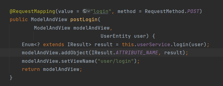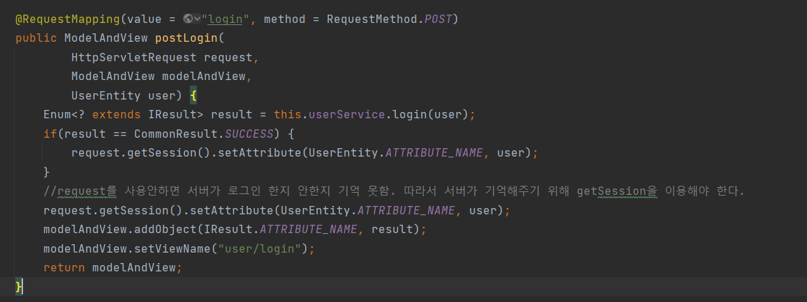 setAttribute는 문자열로 즉, "~~"로 값을 정할 수 있지만 UserEntity의 상수의 변수를 만들어 곳곳에 사용하기 위해 다음과 같이 작성해주었음. 이렇게 해주는 이유는 "user"라는 이름으로 정했다고 했을 때, "User"로 적을 수 있는 실수를 막기 위해!