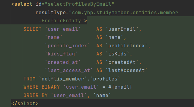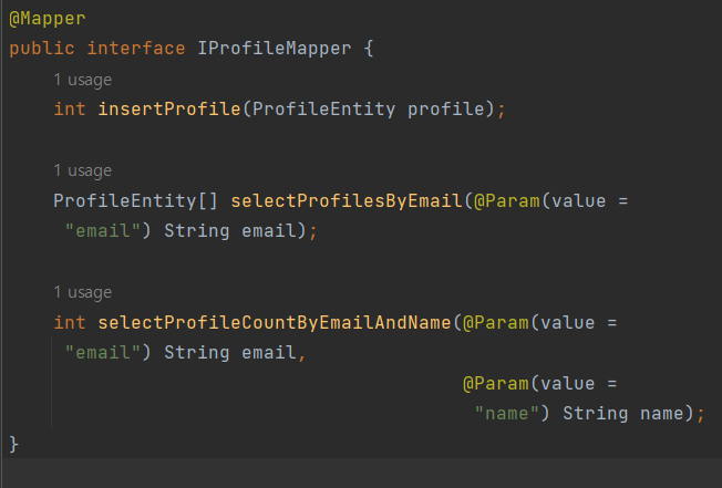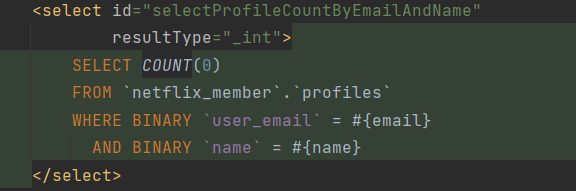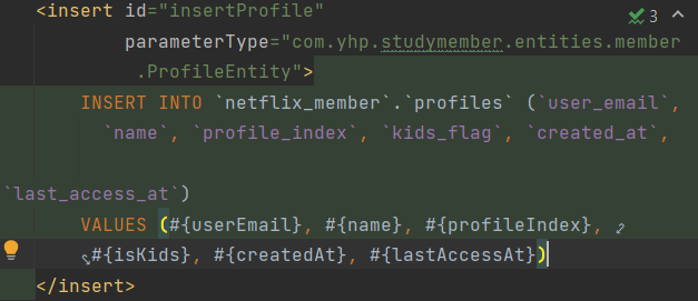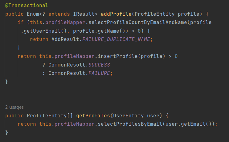 해당 부분은 서비스 부분. 다이내믹 이 섬으로 IResult를 상속받아서 구현하는 addProfile에 프로필 엔티티를 매개변수로 받아주고 이러한 값은 매퍼 부분에 구현. 조건만 한번 확인해보자. addProfile은 만들어진 프로필의 중복, 성공, 실패를 여부로 뒀음 중복인 경우는 매퍼에 걸어둔 COUNT(0)의 값을 기준으로 하기 때문에 그 값이 0보다 클 경우이다.