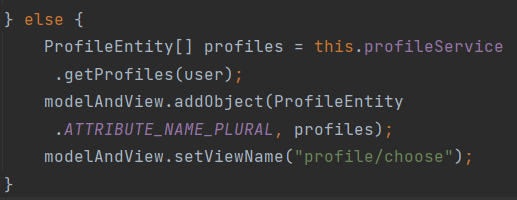 그 값은 프로필 엔티티에 profiles라고 값을 지정해주고 컨트롤에서 위의 사진과 같이 키를 적어주고 값을 profiles로 넣어줌. 그리고 modelAndView의 setViewName을 프로필을 고르라는 창으로 넘긴다.