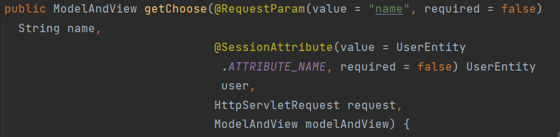 ModelAndView를 받는 getChoose를 만들어주고 앞서 말했듯이 이름을 값으로 받기 때문에 RequestParma 어노테이션 이용, SessionAttribute 어노테이션의 경우 로그인한 유저마다 프로필이 다르기 때문에 해당 어노테이션을 이용하여 로그인한 유저의 값을 알 수 있도록 해줘야 됨.