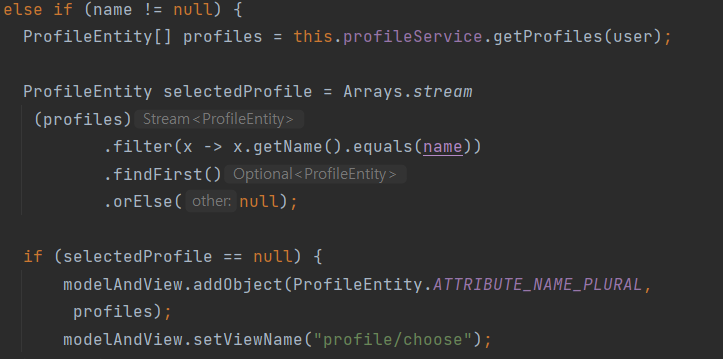 위로 올라가서 보는 게 귀찮으니 다시 사진을 가져오겠음. 우선 앞에서 유저가 없는지 있는지는 고려된 사항 그러면 이제 이름을 확인해야 되는데 이러한 이름이 null이 아니라면 일단 profileService에서 구현한 getProfiles에다가 SessionAttribute로 받는 user의 값을 getProfiles에다가 넣어주고 그러면 이제 유저는 여러 개의 프로필이 있지만 하나를 고를 수 있게 해 줘야 됨. 따라서 RequestParam으로 받은 name으로 그 값을 확인부터 해주는 절차를 가져야 됨. 그래서 filter를 이용해주고. findFirst로 하나만 출력 orElse로 그게 아니라면 null을 때림. 이렇게 해주는 이름이 널이 아니라고 해서 그 값 RequestParam이랑 같은지는 그 어디에서도 구현한 곳이 없기 때문에 확인을 해주는 과정을 해야 됨다. 이렇게 안 해주면 무언가의 에러가 터지겠지? 이제 그리고 해당 selectedProfile이 널이라면 modelAndView에다가 데이터 값을 넣어줄 건데