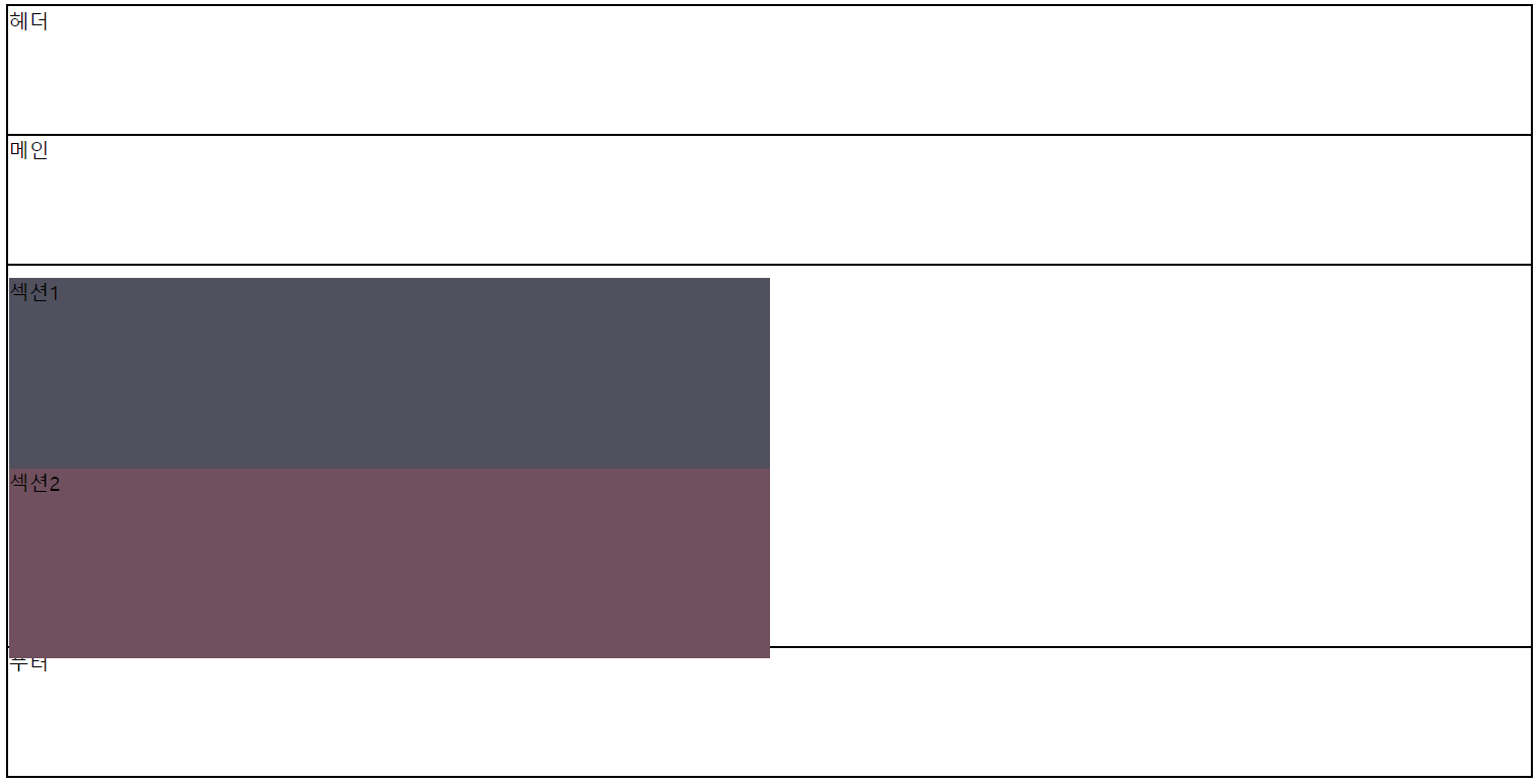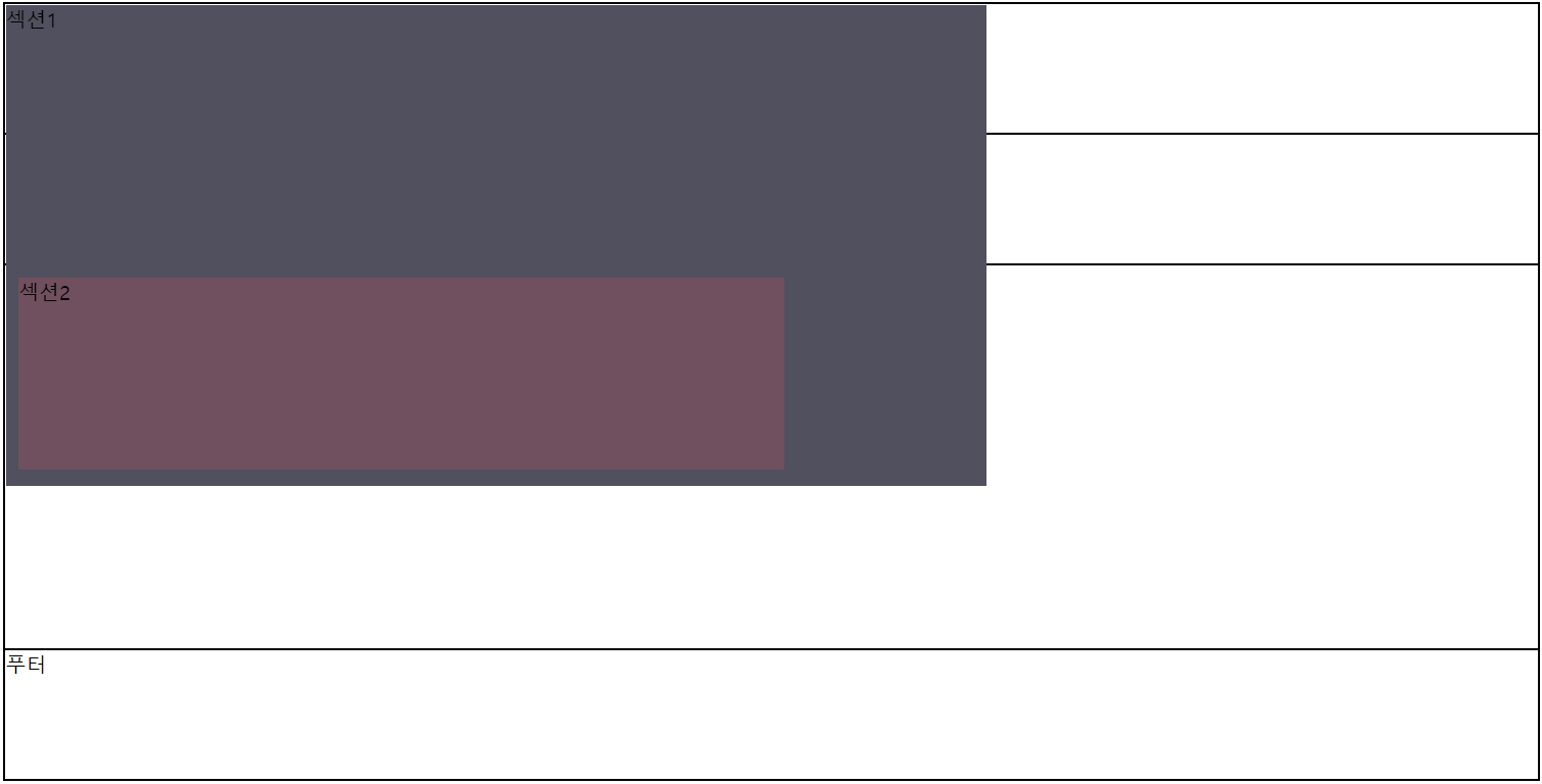 다음의 경우에는 body > article의 position이 기본값 즉, position=static;으로 되어 있기 때문에 body의 영향을 받아서 body 부분을 기점으로 움직이게 됩니다. 합쳐 보이는 이유는 앞서 푸터가 가려진 것처럼 섹션 1이 가려져서 섹션 2가 보이게 되는 것입니다. 사실 이 부분은 앞서 말한 것과 같이 섹션 2가 섹션 1위에 떠있다고 생각하시면 됩니다.