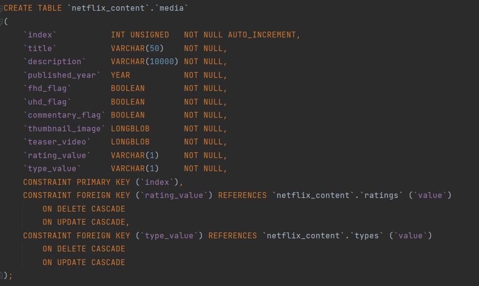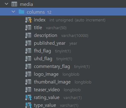우리가 영상을 클릭할 때 해당 영상에 제목, 타이틀, 특징, 장르, 배우들이 나오는 상세보기 창이 있다. 이것 또한 백엔드에서 우리가 구현을 해줘야 되는데 우선 db부터 짜 보자. 우선 미디어라는 즉, 영상이라는 db에서 제목, 타이틀, 특징, 장르 , 배우 들은 영상 안에 포함되는 내용이다.
