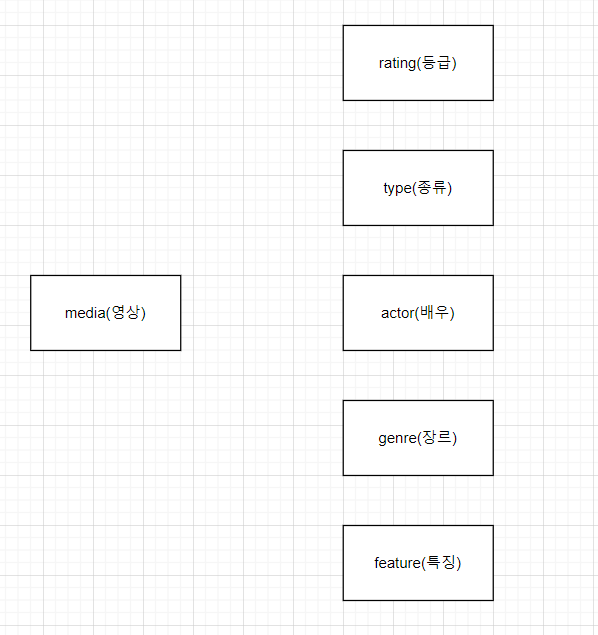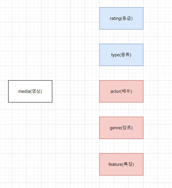 우선 배우는 당연히 일대다의 관계일 것이고. 특징과 장르 또한 일대다의 관계일 것이다. 그럼 등급과 종류는 어떤 관계인 것 인가? 예를 들어 19세 영화로 예를 들어보자. 여기서 19세가 media의 등급이고 영화가 media의 종류일 것이다. 그렇다면 19세랑 영화는 일대다의 관계가 되나? 당연히 안될 것이다. 19세라는 media는 하나씩 있을 것이고 영화라는 media 또한 하나씩 있을 것이다.