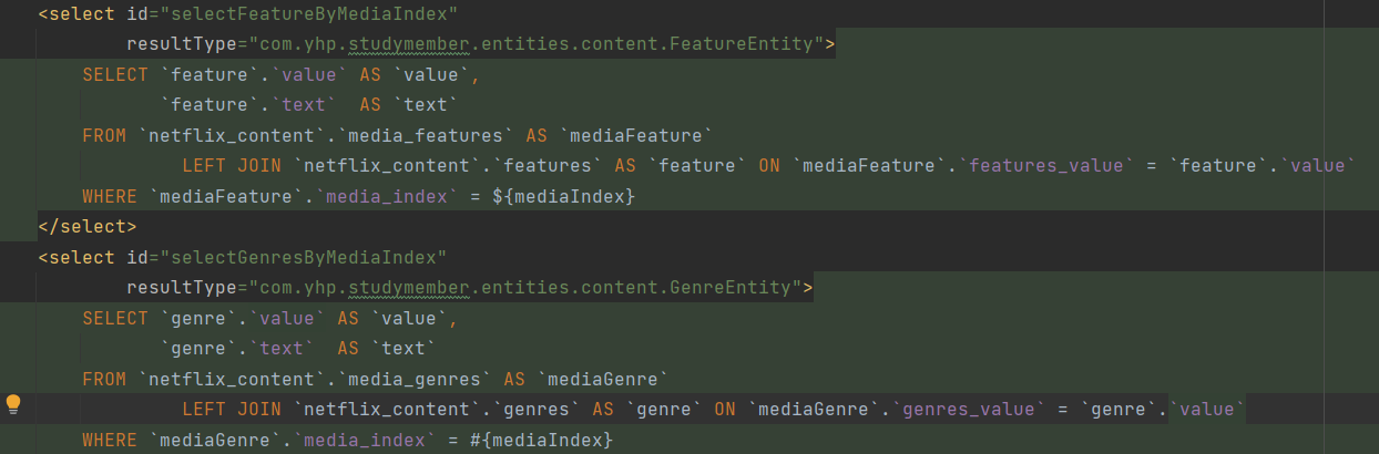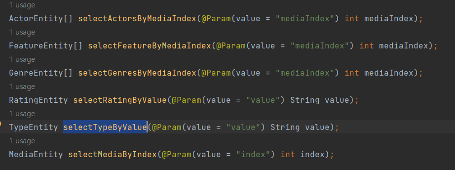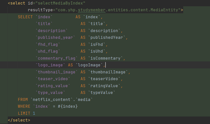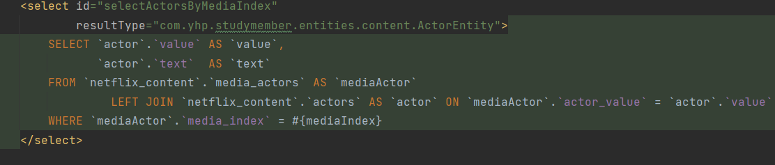 일대다의 경우에는 mediaIndex를 가져오면 되고 일대일의 경우에는 엔티티 자체의 값인 value를 가져오면 된다. 그리고 미디어의 경우에는 index를 가져오면 되겠네. 이렇게 작성해주는 이유는 db에 우리가 일대다의 경우에는 테이블을 하나씩 더 만들어서 그 값을 지정해주었다. ex) 배우 테이블의 경우 미디어배우 테이블을 만들어 주어 미디어 테이블의 값과 배우 테이블의 값을 받도록 해주었다.