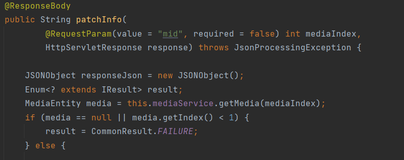 받는 인자의 경우 media의 Index를 받으면 되겠네. 그리고 HttpServeletResponse타입을 이용해 Json의 값을 설정해주기 위해 response를 이용했다. 위에 작성한 PATCH 뒤에다가