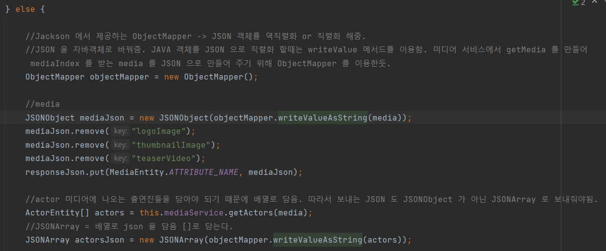 JsonProcessingException을 던져주는 부분이 있다. 이 부분은 우리가 ObjectMapper의 writValueAsString을 JSONObject에다가 담아줄 때 발생하는 예외기 때문에 해당 예외를 처리해줘야 된다. 그러면 위에 코드도 하나씩 알아보자. 주석을 달아 놨지만 한번 더 공부하는 느낌으로 적어보자. ObjectMapper는 우리가 JAVA객체를 직렬화 또는 역직렬화 할 때 사용해주는데 지금 우리는 미디어의 객체를 JSON으로 가지고 있어 줘야 되는데 이때 우리가 일대일로 매핑해준 엔티티에다가 JSON으로 쉽게 직렬화 시킬 수 있게 해 주는 게 ObjectMapper이다. 그리고 writeValueAsString은 직접적으로 직렬 화해 주는 메서드 즉, String 으로 직렬화 시켜준다는 것! 이렇게 직렬화 시켜주면 우선 logoImage와 thumbnaliImage, teaserVideo의 경우는 바이트 타입이기 때문에 우선 담는 로직을 적지 않았으니 Json에 remove 시켜주고 다른 값들이 들어가는지 확인해보자. 그리고 배우의 경우는 일대다의 관계이기 때문에 배열로 만들어 주자. 그리고 서비스에서 테이블과 관련된 로직을 작성해보자.