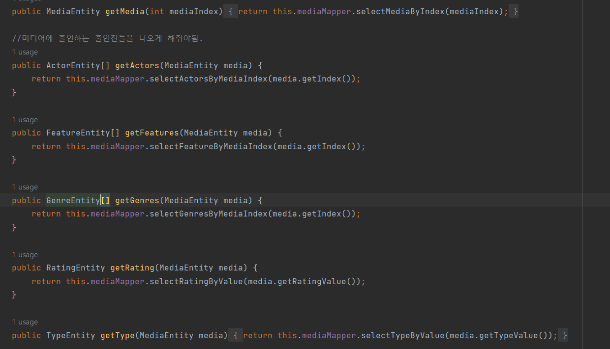 그리고 일대일의 테이블의 경우는 매개변수의 값을 MediaEntity의 값을 받아주면 됨. 타입의 경우는 일대일이니 그냥 자기 자신의 타입을 적어주면 됨.