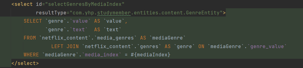 기존에 매퍼에 외래키를 제대로 안 걸어 줬었다!!.. on 뒤에다가 이름을 명시를 제대로 안 해줬었음... 그래서 json으로 받아 올 때 중복이 돼서 작성이 됐음. ex) genres라는 json에 들어가는 값은 법정, 한국 드라마, 사회 문제를 다룬 드라마인데. 값이 중복돼서 법정, 법정, 법정 이런 식으로 값이 중복돼서 들어감. 즉, on에 다가 원하는 값을 적어 줬으면 그거랑 맞는 값을 작성해줘야 됨.
