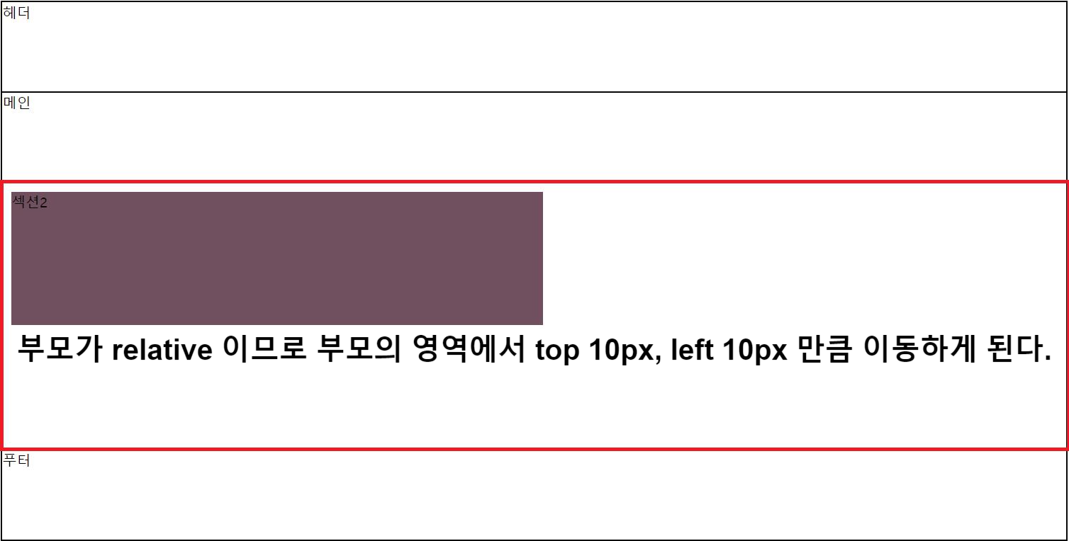 가장 가까운 부모인 body > article의 position이 relative이므로 article의 자식인 section 1, section 2는 부모의 영역 안에서 움직이게 됩니다.