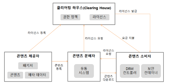 - 클리어링 하우스 : 저작권에 대한 사용 권한, 라이선스 발급, 암호화된 키관리, 사용량에 따른 결제관리 등을 수행하는 곳
