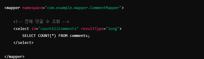 MyBatis XML 파일에 전체 댓글 수를 조회하는 쿼리를 작성합니다.